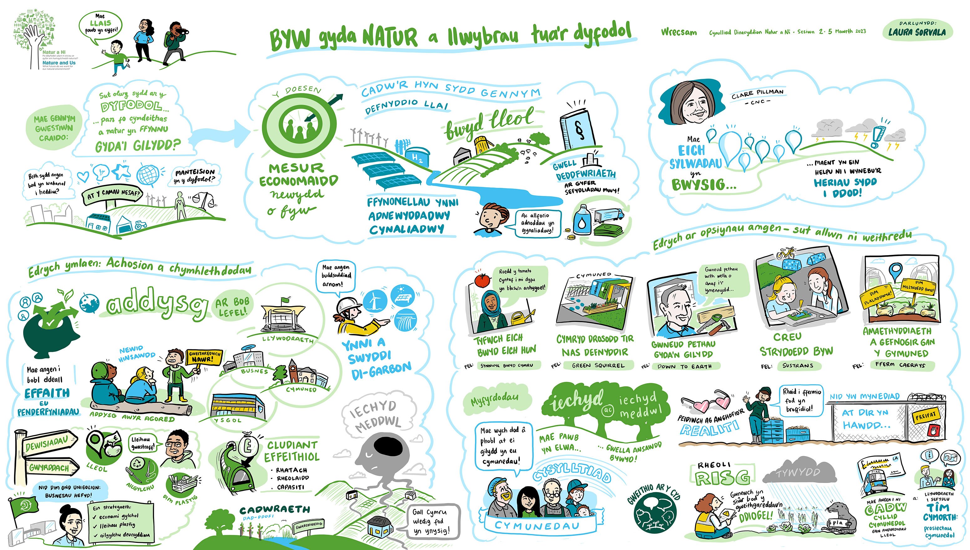 Sut olwg sydd ar y dyfodol pan fydd cymdeithas a natur yn ffynnu gyda’i gilydd?